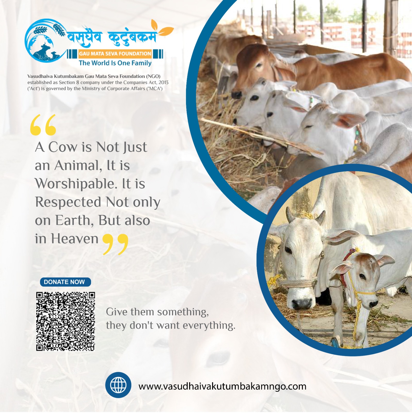 Vasudhaiva Kutumbakam NGO provides essential care, food, and medical aid to abandoned cows and other animals. As a registered non-profit with the Government of India, we offer shelters to protect these animals and ensure their well-being. Donations to our NGO qualify for 80G tax deductions, allowing you to support a noble cause while benefiting from tax savings. Help us make a difference today!